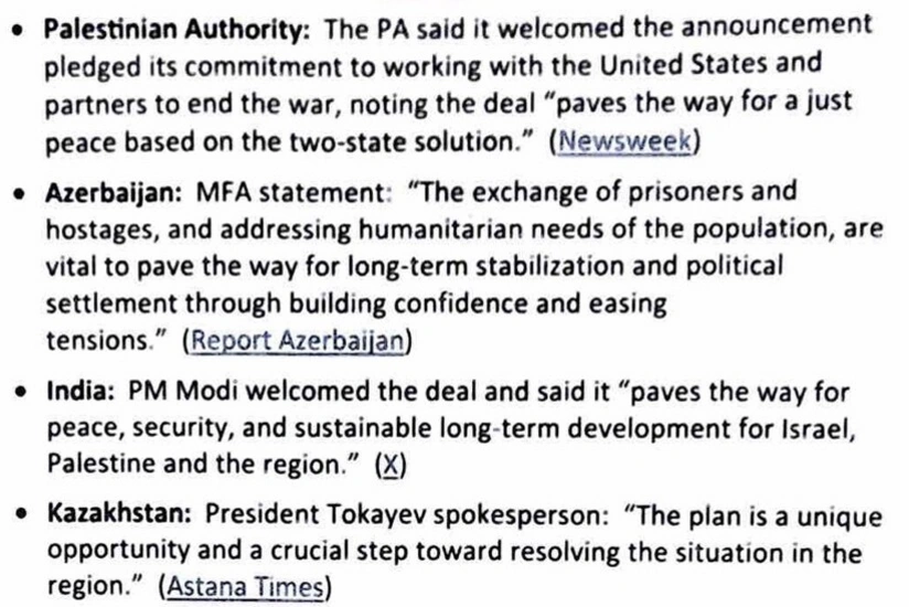 Trampın Qəzza planı ərəb və İslam ölkələri tərəfindən də dəstəklənir. Səudiyyə Ərəbistanı, İordaniya, BƏƏ, İndoneziya, Pakistan, Türkiyə, Qətər və Misirin xarici işlər nazirləri birgə bəyanat yayaraq, Donald Trampın Qəzza zolağında müharibəyə son qoymaq üçün göstərdiyi səmimi səyləri alqışlayıb və onun sülhə aparan yol tapa biləcəyinə əminlik ifadə ediblər.