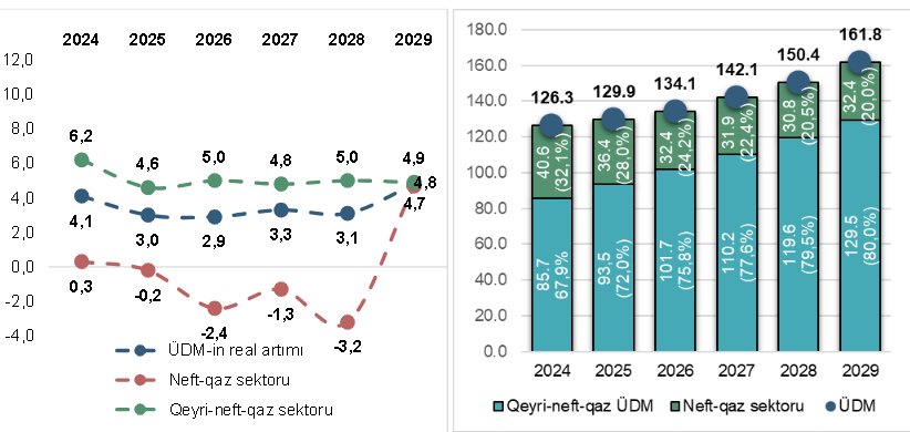 2026-2029-cu illər üzrə Ortamüddətli Xərclər Çərçivəsinə əsasən, 2026-cı ilin sonuna ÜDM-in həcmi 129,2 milyard manat, o cümlədən qeyri-neft ÜDM-in həcmi 92,2 milyard manat təşkil edəcək. Ortamüddətli dövr üçün makroiqtisadi proqnozlara görə, 2026-cı ilin sonuna ÜDM-in həcmi 134,1 milyard manat, o cümlədən qeyri-neft-qaz ÜDM-in həcmi 101,7 milyard manat təşkil edəcəyi, 2029-cu ildə isə ÜDM-in 161,8 milyard manata qədər, o cümlədən qeyri-neft-qaz ÜDM-in həcminin 129,5 milyard manata qədər artacağı gözlənilir. Ortamüddətli dövrdə ÜDM-in real artım tempinin orta illik 3,5 faiz, qeyri-neft-qaz ÜDM-nin 4,9 faiz olacağı fərz edilir.
