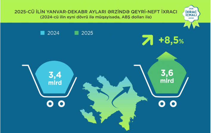 2025-ci ildə Azərbaycanın qeyri-neft sektoru üzrə ixracı 2024-cü illə müqayisədə 8,5 faiz artaraq 3,6 milyard dollar təşkil edib. İqtisadi İslahatların Təhlili və Kommunikasiya Mərkəzinin dərc etdiyi “İxrac icmalı”nda qeyd edilir ki, ötən il yeyinti məhsulları üzrə ixrac 18,4 faiz artaraq 1,2 milyard dollara bərabər olub. İxrac olunan şəkər ötən ilin müvafiq dövrünə nəzərən 57,4, meyvə-tərəvəz 27,4, alüminium və onlardan hazırlanan məmulatlar 24,2, pambıq iplik 19,3, kimya sənayesi məhsulları 8, bitki və heyvan mənşəli piylər və yağlar 2 faiz artıb.