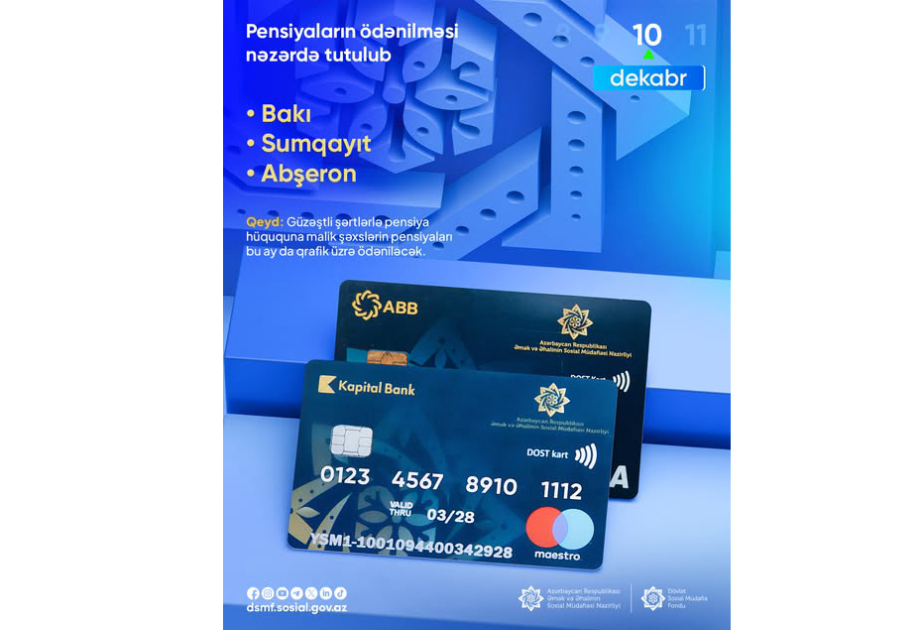 Sabah Bakı, Sumqayıt və Abşeron üzrə pensiyalar ödəniləcək