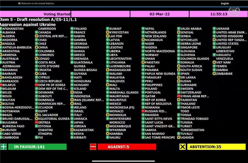 Onlardan 5 ölkə qətnamənin əleyhinə səs verib: Rusiya, Belarus, Suriya, Şimali Koreya, Eriteriya.