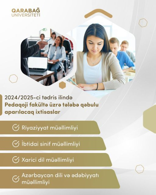 Qarabağ Universiteti 2024/2025-ci tədris ilində Humanitar və sosial elmlər fakültəsi, Pedaqoji fakültə üzrə tələbə qəbulu həyata keçirəcək.