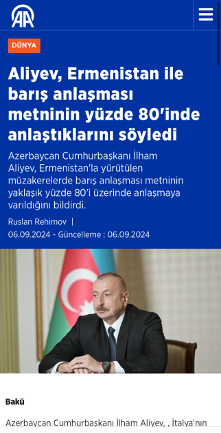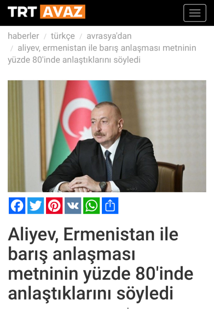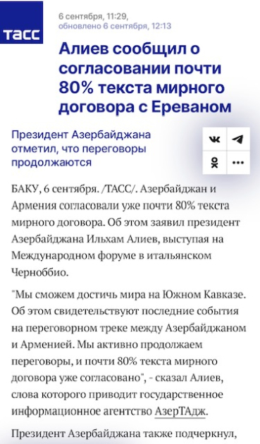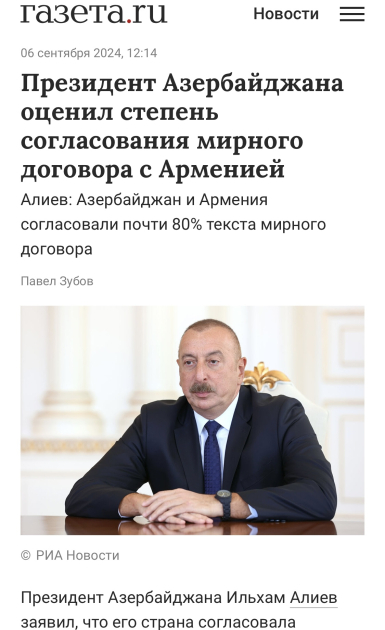 Rusiya mediası Prezident İlham Əliyevin Azərbaycan və Ermənistan arasında sülh müqaviləsinin təqribən 80 faizinin artıq razılışdırıldığı, sərhədlərin delimitasiyası prosesinin başlandığı və sərhədin 13 kilometrlik hissəsinin demarkasiya edildiyi barədə fikirlərini xüsusi vurğulayıb.