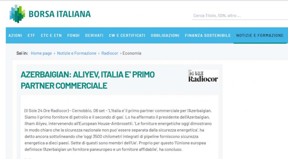 İtaliyanın RAI, ANSA, “Borsa Italiana” və digər mətbu orqanlarında dərc olunan yazılarda Prezident İlham Əliyevin Forumdakı çıxışında Azərbaycan və İtaliyanın uzun illər ərzində strateji tərəfdaşlar kimi fəaliyyət göstərdiyini qeyd etdiyi bildirilir. Vurğulanır ki, İtaliya Azərbaycanın dünyada bir nömrəli ticarət tərəfdaşıdır. Azərbaycan İtaliyanın bir nömrəli neft və ikinci ən böyük qaz təchizatçısıdır.