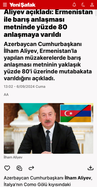 “Əliyev Ermənistanla sülh sazişinin mətninin 80 faizini razılaşdırdıqlarını bildirib”, “Azərbaycan Prezidenti İlham Əliyev: Sülh sazişi mətninin 80 faizi üzrə razılıq əldə olunub”, “Əliyevdən “Ermənistan” mesajı: Biz 80 faizlə razılaşdıq”, “Əliyev açıqladı: Ermənistanla sülh sazişi mətninin 80 faizi ilə bağlı razılıq əldə edilib” və digər sərlövhələrlə yayımlanan xəbərlərdə Prezident İlham Əliyevin forumdakı çıxışına istinadlar edilib.