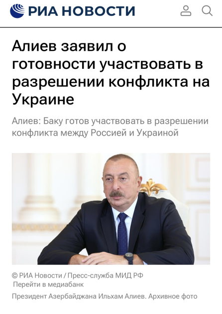 Eyni zamanda, xəbərlərdə dövlət başçısının Azərbaycanın Rusiyaya qarşı sanksiyalar kampaniyasına qoşulmayacağı və iki ölkə ilə praqmatik münasibətlər fonunda, lazım gələrsə, Rusiya-Ukrayna münasibətlərinin normallaşmasında vasitəçi rolu oynamağa hazır olduğu barədə fikirləri də yer alıb. Media yazır ki, Azərbaycan Lideri Rusiya-Ukrayna müharibəsinin sona çatması istiqamətində ciddi irəliləyiş üçün zəmin olduğunu vurğulayıb.