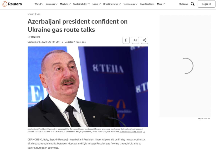 Materiallarda Prezident İlham Əliyevin Ukrayna ərazisindən qaz tranzitinin davam etdirilməsi ilə bağlı danışıqlarda irəliləyiş olacağına müəyyən nikbinlik ifadə etdiyi bildirilir. Vurğulanır ki, dövlətimizin başçısı Ukrayna ərazisindən qaz tranzitinin davam etdirilməsi ilə bağlı Rusiya, Ukrayna və Avropa təsisatlarının Azərbaycana müraciət etdiyini, ümumi məxrəcə gəlmək üçün böyük səylər göstərildiyini deyib. Qeyd edib ki, Azərbaycan bu kontekstdə hər iki ölkə ilə təmasdadır və ciddi irəliləyiş üçün zəmin var.