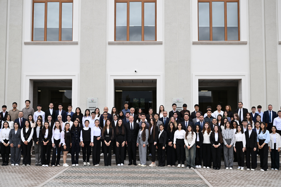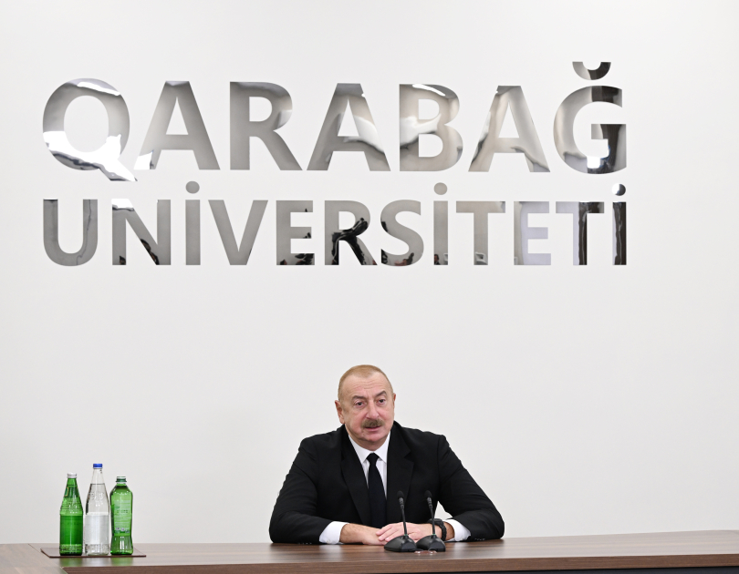 Bu gün, eyni zamanda, Qarabağ Universitetinin açılışıdır. Bu açılış istənilən gündə ola bilərdi. Amma hesab etdim ki, 20 sentyabrda olsa, daha düzgün olar. Çünki bu, artıq şanlı tariximizdir. Hesab edirəm ki, Qarabağ Universitetinin yaradılması tarixi hadisədir və keçən ilin noyabrında müvafiq Sərəncam imzalandı. Sonra mən buraya baş çəkdim. Artıq mənim buraya üçüncü gəlişimdir və bütün göstərişlər verildi, Elm və Təhsil Nazirliyi tezliklə bütün lazımi tədbirləri gördü. Demək olar ki, bina yenidən quruldu. Bu bina sovet dövründə Azərbaycan memarları, inşaatçıları tərəfindən inşa edilmişdi. İşğal dövründə bunu erməniləşdirmək üçün müəyyən işlər görülmüşdü. O əlamətlər də tamamilə silindi. Binanın önü açıldı, gözəl bir park yaradıldı. Master-plan hazırlandı, yəni gələcək illərdə, yəqin ki, növbəti üç ildə yeni tədris korpusları inşa ediləcək. Gözəl yataqxana yaradıldı, bu gün tanış olmuşam. Ən önəmlisi gənclər, yəni tələbələr buraya böyük həvəslə gəlməyə başladılar. İndi mənə məlumat verildi ki, 1200 tələbə var. Ölkəmizin hər bir bölgəsindən tələbə var. Yüksək bal toplayan, o cümlədən 600-dən çox bal toplayan tələbələr bizimlə görüşdə iştirak edirlər və buraya böyük həvəslə gəlmişlər. Müəllim heyəti də formalaşdı. Bilirəm ki, müəllimlər də böyük həvəslə bu işə başlayırlar və ümid edirəm ki, Qarabağ Universiteti bizim aparıcı ali məktəblərdən birinə çevriləcəkdir. Bunu etmək üçün bütün imkanlar var. İndi verilən məlumata görə, artıq altı fakültə yaradılıb. Növbəti illərdə Tibb fakültəsi də yaradılacaq. Xocalıda Aqrar elmlər fakültəsi, Şuşada Turizm fakültəsi fəaliyyət göstərəcək. Yəni, bu, bir neçə şəhəri birləşdirən universitet olacaq. Əlbəttə ki, Qarabağa qayıdacaq keçmiş köçkünlər, onların uşaqları burada oxuyacaq və ölkəmizin hər bir yerindən gənclər buraya gələcəklər.