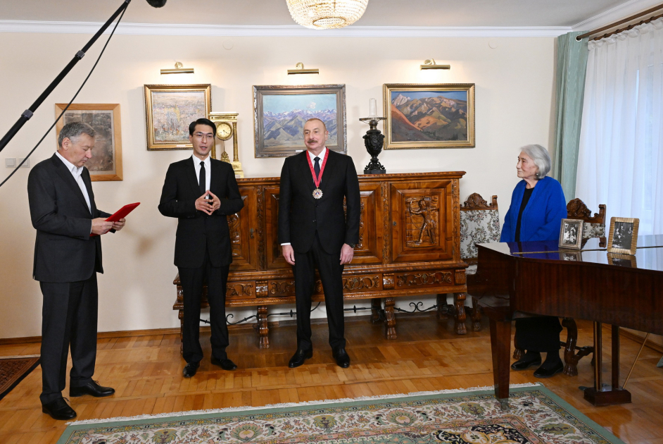 Dərin hörmət və qürur hissi ilə Sizə müasir dünyada və ümumi mədəni irsimizin qorunub saxlanmasında oynadığınız rola verilən yüksək qiymətin əlaməti olan “Çingiz Aytmatov” ordenini təqdim edirəm. Sağ olun.