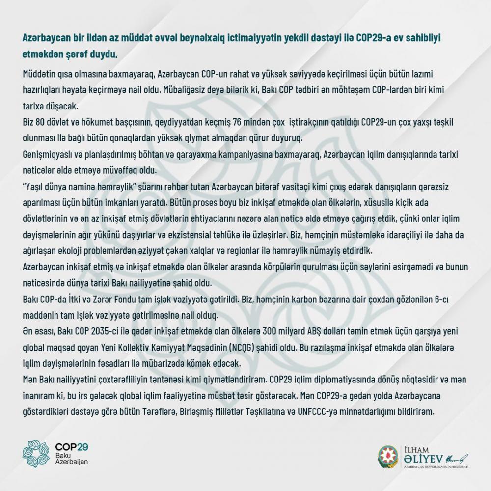Azərbaycan Respublikasının Prezidenti İlham Əliyev noyabrın 24-də sosial şəbəkə hesablarında “COP29 iqlim diplomatiyasında dönüş nöqtəsidir!” sərlövhəsi ilə paylaşım edib.