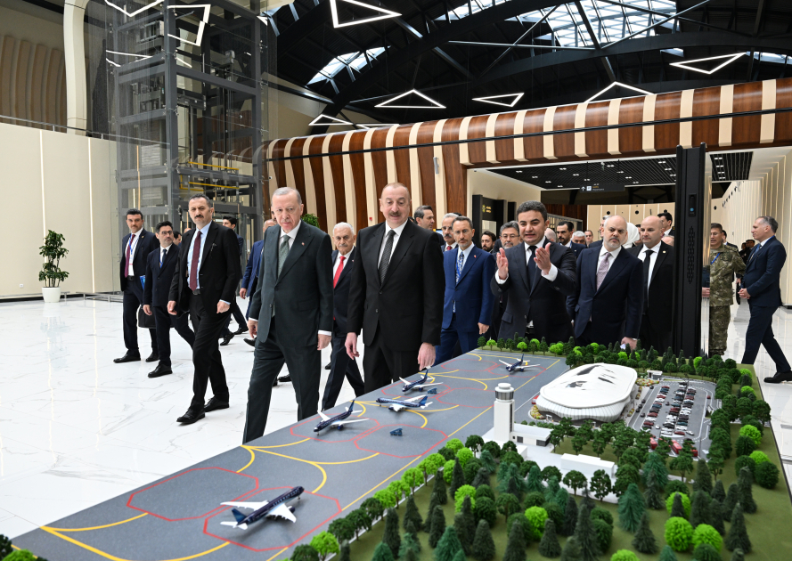 Azərbaycan və Türkiyə prezidentləri hava limanının rəmzi açılışını bildirən lenti kəsiblər.