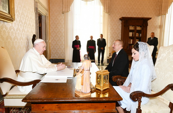Sonra Prezident İlham Əliyev və birinci xanım Mehriban Əliyeva Katolik Kilsəsinin rəhbəri Papa Fransisk ilə görüşdülər.