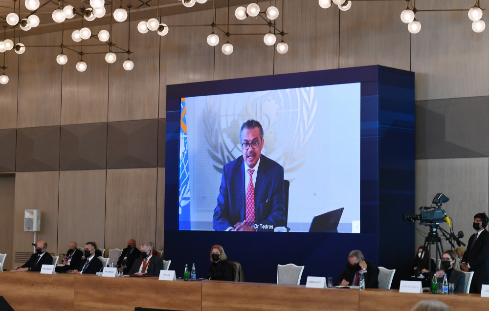 Daha sonra Ümumdünya Səhiyyə Təşkilatının Baş direktoru Tedros Adhanom Qebreyesus videobağlantı vasitəsilə çıxış edərək dedi: Hamı üçün bərabər səhiyyə imkanlarının təmin olunması ilə bağlı razılığa gəldik və mən Azərbaycan Prezidentinə öz minnətdarlığımı bildirirəm ki, Ümumdünya Səhiyyə Təşkilatına maliyyə yardımı göstərmişdir və Qoşulmama Hərəkatının sədri kimi təşəbbüslə çıxış etmişdir ki, peyvənd digər ölkələrlə bölüşdürülsün. Bizim multinaturalizm qlobal çağırışlarla mübarizənin aparılması üçün vacib bir məqamdır. Lakin çoxtərəfli səylərimizə və bərabərliyi təmin etmək üçün gördüyümüz işlərə baxmayaraq, bəzi suallar bizdən daha çox həmrəylik tələb edir.