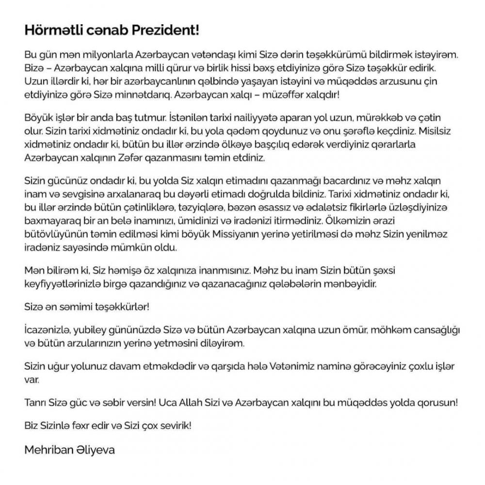 Bu gün mən milyonlarla Azərbaycan vətəndaşı kimi Sizə dərin təşəkkürümü bildirmək istəyirəm. Bizə – Azərbaycan xalqına milli qürur və birlik hissi bəxş etdiyinizə görə Sizə təşəkkür edirik. Uzun illərdir ki, hər bir azərbaycanlının qəlbində yaşayan istəyini və müqəddəs arzusunu çin etdiyinizə görə Sizə minnətdarıq. Azərbaycan xalqı – müzəffər xalqdır!