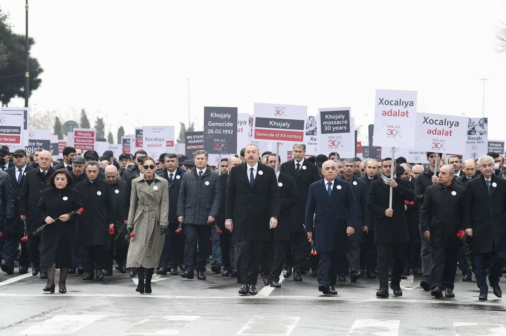 İlham Əliyev və Mehriban Əliyeva Xocalı soyqırımının 30-cu ildönümü ilə əlaqədar Bakıda keçirilən ümumxalq yürüşündə iştirak edirlər