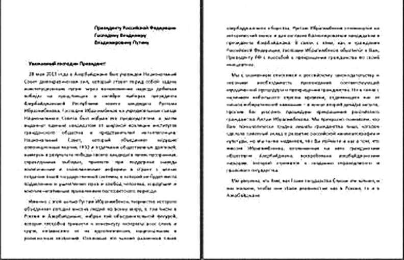 - Məktubun sonunda isə “Biz əminik ki, dövlət başçısı kimi bu hisslər cənab Putin, Sizə yaxındır və biz istəyirik ki, onlar Rusiyada olduğu kimi Azərbaycanda da reallığa çevrilsin” ,- deyə qeyd olunmuşdu. İlham Əliyev diplomatik əlaqələrin inkişafından, Azərbaycanın strateji maraqlarından bəhs edir, “milli şura” adlı konyuktur dərnək isə “Rusiyanın Azərbaycanda hüququ bərqərar etməsi”dən. İndi sual olunur: qüsurlu yanaşma hansıdır?!
