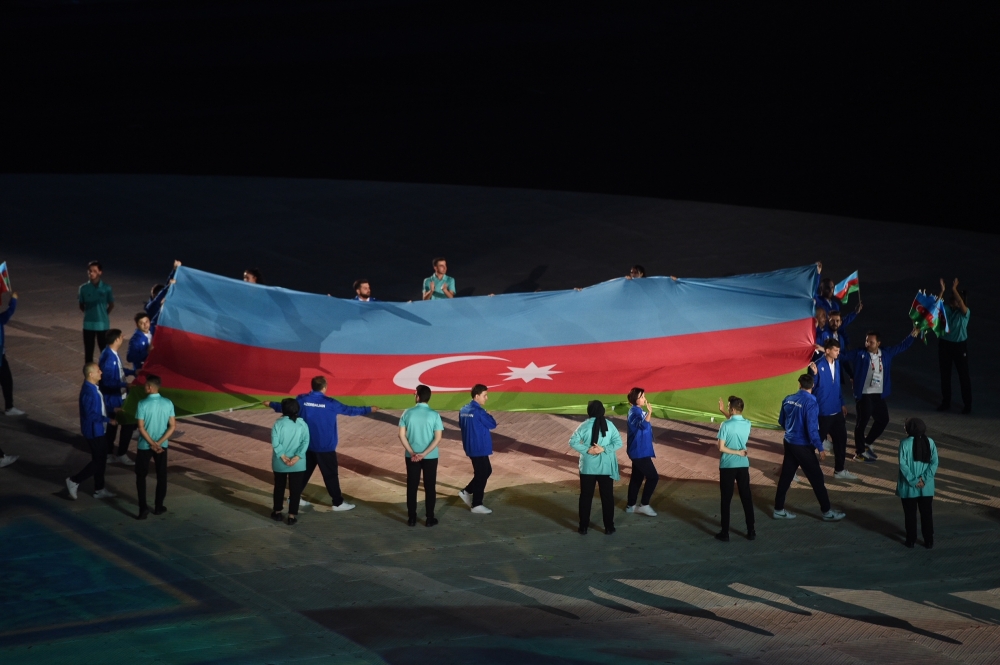 Açılış mərasimində Azərbaycanın üçrəngli bayrağını atlet Nazim Babayev və voleybolçu Ayşən Abduləzimova apardılar.