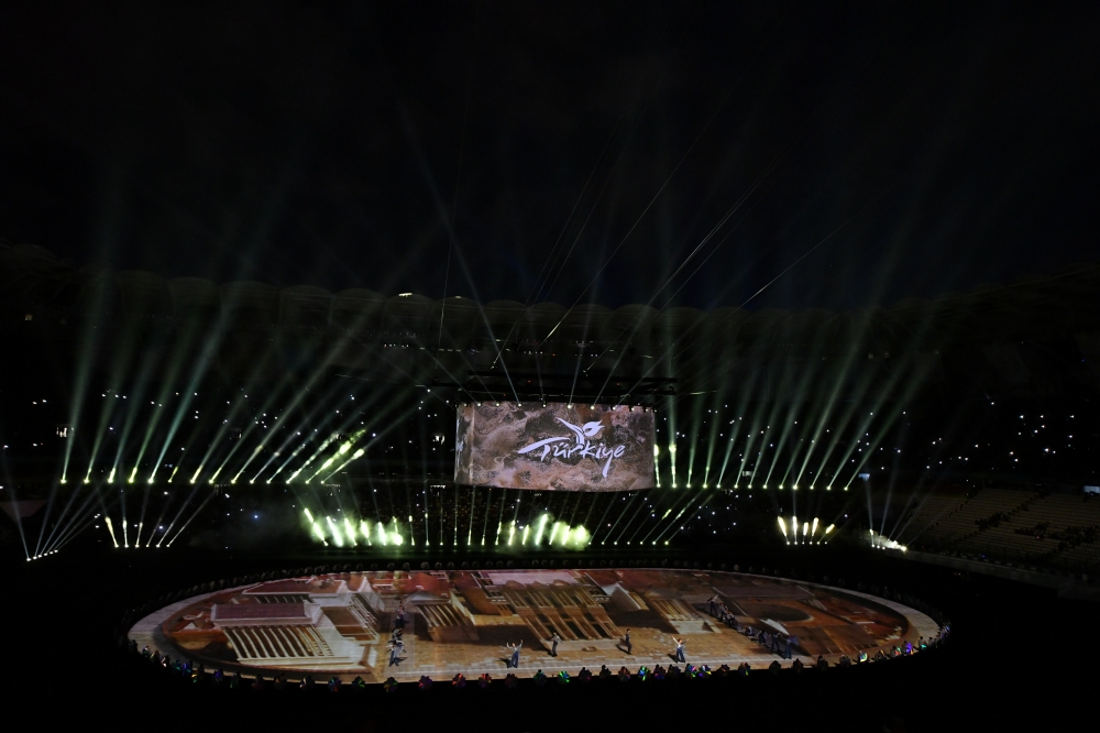 Açılış mərasimində Türkiyə tarixinin müxtəlif dövrlərini və mədəni zənginliklərini əks etdirən kompozisiya nümayiş olundu. Kompozisiyanın sonunda işıq effektləri vasitəsilə səhnədə Türkiyə bayrağı və ay-ulduz fiquru təcəssüm etdirildi. Ardınca hərbçilər Türkiyənin Dövlət Bayrağını səhnəyə gətirdilər. Bayraq Türkiyənin Dövlət Himni – “İstiqlal Marşı”nın sədaları altında qaldırıldı.
