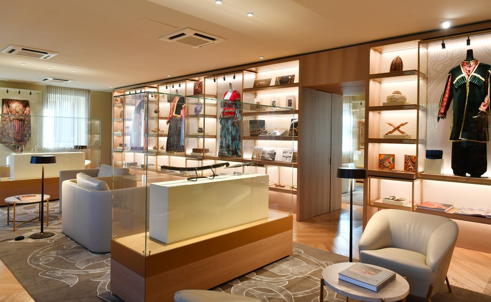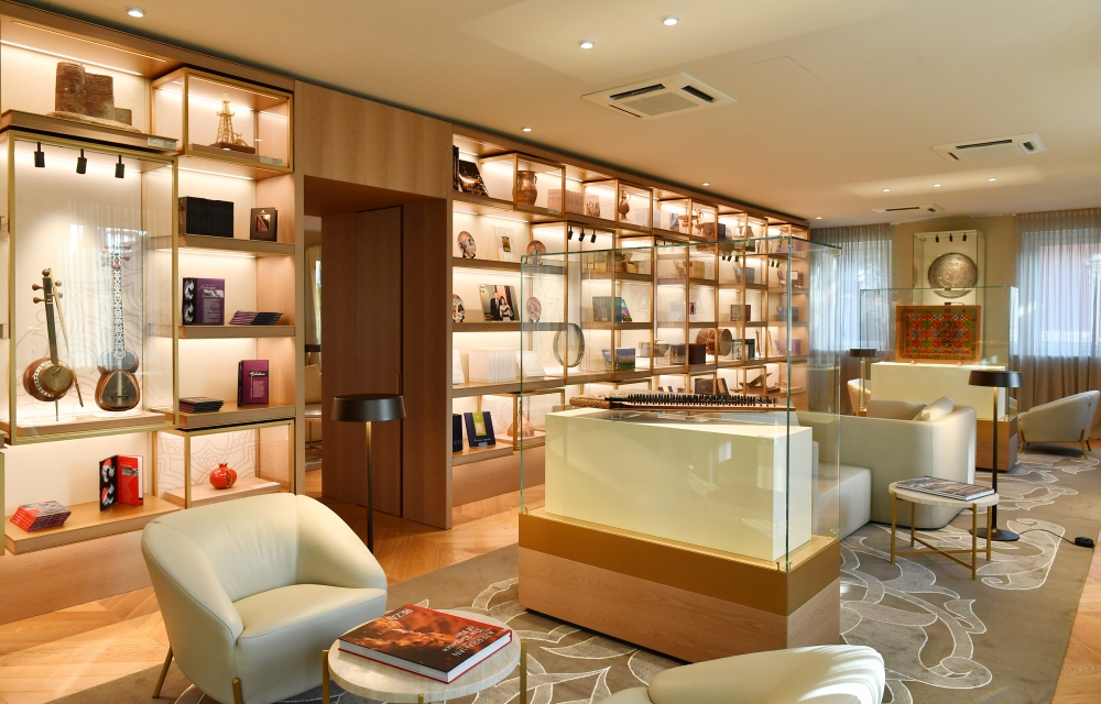 Azərbaycan xalçaları mərkəzdəki ekspozisiyanın ən qiymətli inciləri sırasındadır. Milli xalçaçılığımızın müxtəlif məktəblərinin nümunələrinin təqdim edildiyi mərkəzdə qədim xalça və xalça məmulatlarının geniş çeşidi sərgilənir. Burada Azərbaycan xalçaçılıq məktəblərinin tarixi və keçdiyi inkişaf yolları barədə italyan dilində məlumat verilir. Bundan başqa, Azərbaycan miniatürləri, ölkəmizdə qədimdən yaranıb formalaşan rəssamlıq sənəti - miniatür məktəbi barədə ətraflı məlumat verilir. Zinət və müxtəlif bəzək əşyalarının, xalq incəsənətinin bütün istiqamətlərinə dair nümunələrin, taxta üzərində oyma sənətinin təqdim olunduğu mərkəzin ekspozisiyasında Azərbaycan milli geyimləri də diqqəti cəlb edir.