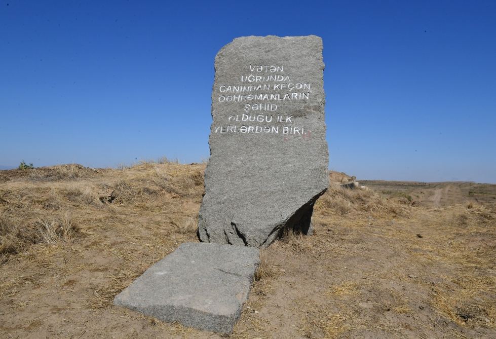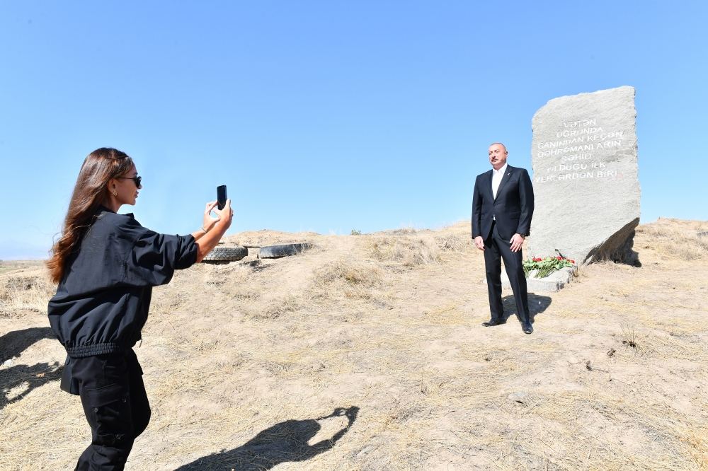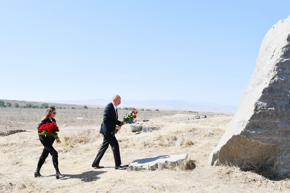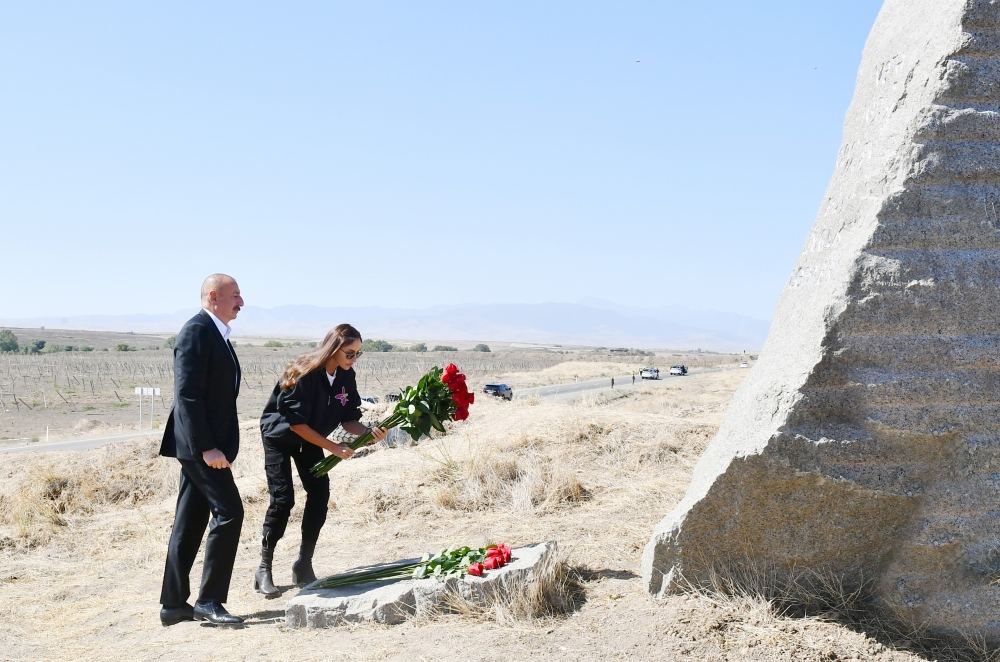 Şəhidlərimizin şərəfinə bu abidə - bu qaya parçası burada, Qaraxanbəyli kəndinin yaxınlığında ucaldılıb. Qaraxanbəyli kəndi və digər beş kənd İkinci Qarabağ müharibəsinin ilk günündə azad edilmişdir. Qaraxanbəyli, Qərvənd, kənd Horadiz, Yuxarı Əbdürrəhmanlı - Füzuli rayonunun kəndləri və Cəbrayıl rayonunun kəndləri - Böyük Mərcanlı və Nüzgar kəndi müharibənin ilk günündə azad edilmişdir. İlk şəhidləri biz məhz burada, bu yerdə vermişik. Bu abidənin yanında düşmənin səngəri yerləşirdi. Bu istiqamətdə beş-altı müdafiə xətti mövcud idi. Azərbaycan əsgəri, Azərbaycan zabiti bu müdafiə xəttini və bundan sonrakı müdafiə xətlərini yarmaq üçün ölümə gedirdi. Sözün əsl mənasında ölümə gedirdi, öz canını fəda edirdi ki, üçrəngli Bayrağımız Şuşada və o vaxt işğal altında olan digər bütün torpaqlarda dalğalansın. Öz canını fəda edirdi ki, Azərbaycan xalqı ləyaqətini bərpa etsin, ədaləti bərpa etsin və xalqımız öz torpaqlarına qayıtsın.