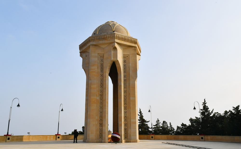 Prezident İlham Əliyev “Əbədi məşəl” abidəsinin önünə əklil qoydu.