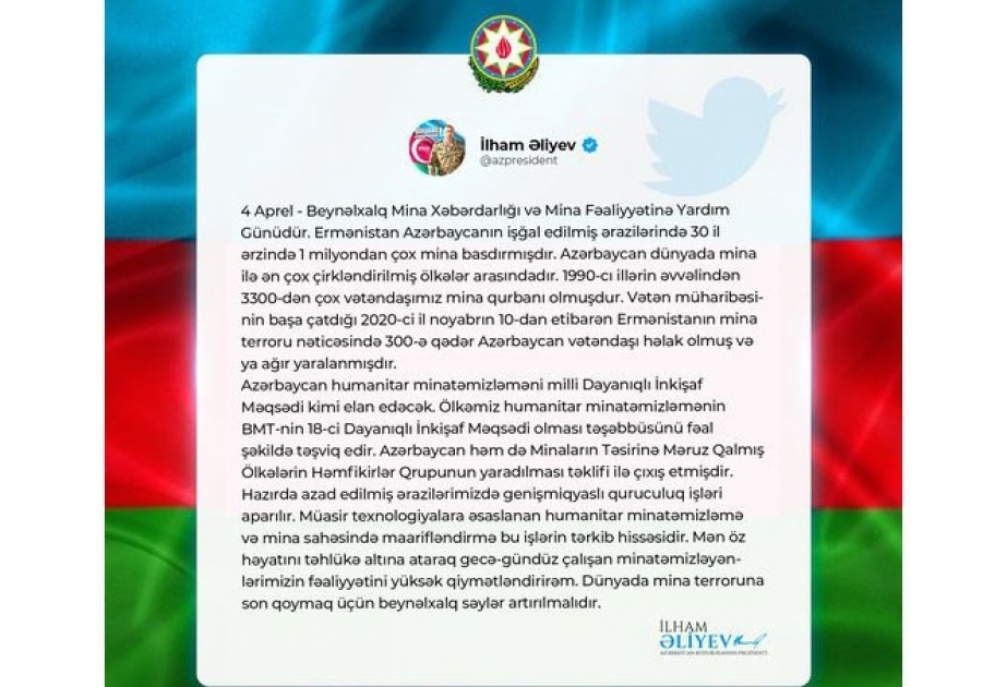 Azərbaycan Respublikasının Prezidenti İlham Əliyev 4 Aprel - Beynəlxalq Mina Xəbərdarlığı və Mina Fəaliyyətinə Yardım Günü münasibətilə sosial şəbəkələrdəki hesablarında paylaşım edib.