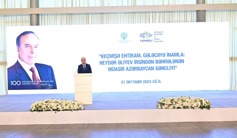 Oktyabrın 21-də Heydər Əliyev Mərkəzində Yeni Azərbaycan Partiyasının (YAP) Mərkəzi Aparatı və Azərbaycan Dövlət Neft və Sənaye Universitetinin (ADNSU) birgə təşkilatçılığı ilə Ümummilli Lider Heydər Əliyevin 100 illik yubileyinə həsr olunmuş “Keçmişə ehtiram, gələcəyə inamla: Heydər Əliyev irsindən bəhrələnən müasir Azərbaycan gəncliyi” mövzusunda tədbir keçirilib.