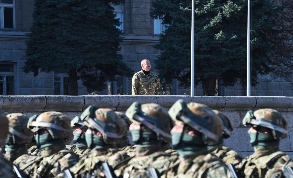 Bu günü bizə bəxş edən müzəffər Silahlı Qüvvələrimiz döyüş meydanında cəsarət, qəhrəmanlıq, fədakarlıq göstərərək düşməni bizim əzəli torpaqlarımızdan qovmuşdur. Bu, böyük tarixi hadisədir. Azərbaycan xalqının çoxəsrlik tarixində buna bənzər parlaq Qələbə olmamışdır. Şuşa əməliyyatı, 44 gün ərzində apardığımız bütün digər hərbi əməliyyatlar, hərbçilərimizin şücaəti bir qəhrəmanlıq dastanıdır. Qırx dörd gün ərzində döyüş meydanında düşməni məğlub edərək, şəhər və kəndlərimizi azad edərək Azərbaycan əsgər və zabiti əsl qəhrəmanlıq göstərmişdir. Hər gün biz irəli gedirdik, bir gün belə geriyə addım atmamışdıq. Düşmən ordusu Azərbaycan Ordusunun, Silahlı Qüvvələrin peşəkarlığını, fədakarlığını görərək daha da böyük təşvişə düşürdü və onların özlərinin etirafına görə, 44 günlük müharibə zamanı Ermənistan ordusunda 12 min fərari olmuşdur. Azərbaycan Silahlı Qüvvələrinin bir nəfər də olsun hərbçisi döyüş meydanını tərk etməmişdir. Bu, Azərbaycan xalqının əyilməz ruhunu və yüksək mənəvi keyfiyyətlərini bir daha bütün dünyaya nümayiş etdirdi.