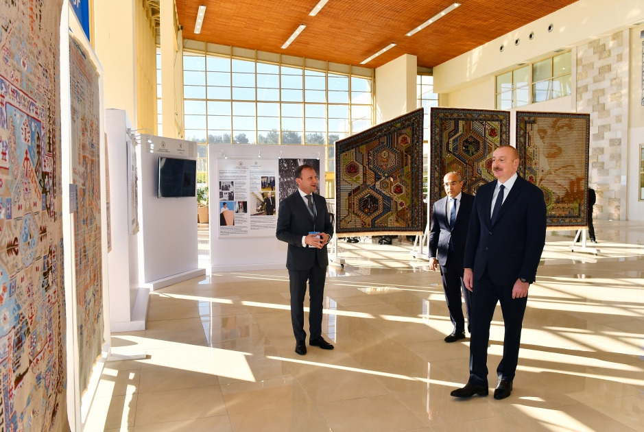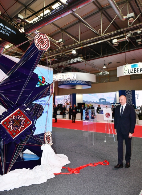 Prezident İlham Əliyev “Azərxalça” ASC tərəfindən hazırlanan “Bizi birləşdirən dəyər” instalyasiyasının üzərindəki ağ örtüyü götürməklə sərginin rəsmi açılışını etdi. Bu instalyasiya SPECA ölkələrinin əməkdaşlıq əlaqələrini əks etdirir.