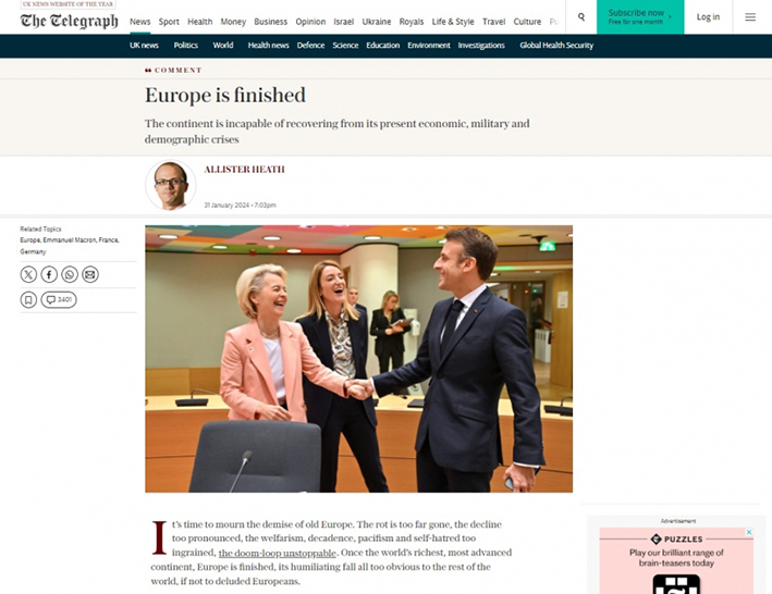 Məqalənin müəllifi Allister Heathin fikrincə, Avropanın çürüməsi prosesi o qədər dərinə gedib ki, artıq onu geri qaytarmaq mümkün deyil. Vaxtilə Avropa inkişaf edən varlı qitə idi. Lakin indi Avropanın sonu çatıb və bunu avropalılardan başqa bütün dünya başa düşür. İqtisadi gərginlik, geosiyasi qeyri-müəyyənlik, miqrasiya böhranı, inteqrasiya proseslərinin yarımçıq qalması və demokratiya qıtlığı metastaz verməyə başlayıb. Problemlər o qədər dərinləşib ki, Avropanın siyasi elitasının eqoist və demaqoq siyasətçiləri onları həll etmək iqtidarında deyillər.
