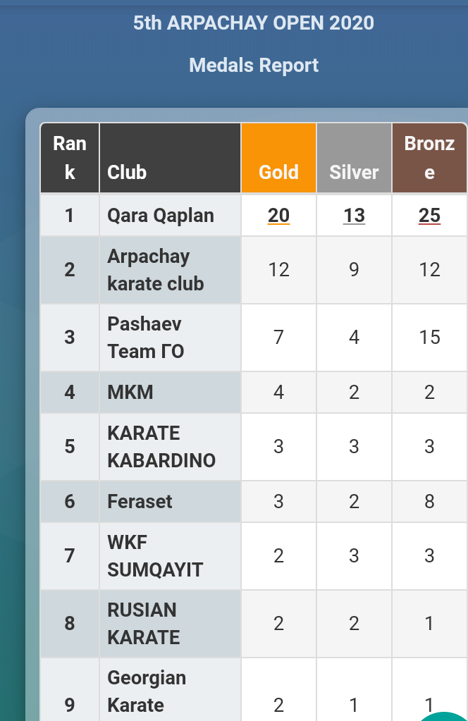 Xatırladaq ki, AMKF və Arpaçay Karate Klubunun birgə təşkilatçılığı ilə ənənəvi olaraq keçirilən və 20 Yanvar şəhidlərinin xatirəsinə həsr olunan, sayca 5-ci olan açıq turnirdə 12 ölkəni (Azərbaycan, Əmman, Gürcüstan, İran, Küveyt, Qazaxıstan , Özbəkistan, Mərakeş, Rusiya, Türkmənistan, Türkiyə, Ukrayna və s.) təmsil edən 89 klubun 939 idmançısı mübarizə aparıb.
