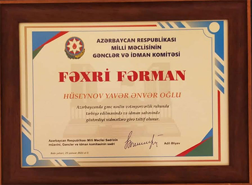 Bu günlərdə Arpaçay Karate Klubunun prezidenti, Əməkdar məşqçi Yavər Hüseynov Azərbaycanda gənc nəslin vətənpərvərlik ruhunda tərbiyə edilməsində və idman sahəsində göstərdiyi xidmətlərə görə Azərbaycan Respublikası Milli Məclisinin Gənclər və idman komitəsinin Fəxri Fərmanı ilə təltif edilib. Bu barədəməlumat verən Y.Hüseynov deyib ki, Fəxri Fərmanı ona Azərbaycan Respublikası Milli Məclisi Sədrinin müavini, Gənclər və İdman komitəsinin sədri Adil Əliyev təqdim edib.