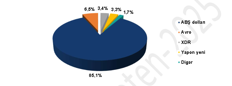 Borcun valyuta ilə strukturunda isə əsas yer dollar öhdəlikləridir. Belə ki, xarici dövlət borcunun 85,1 faizi dollarla cəlb edilmiş vəsaitlərdir. Borcun tərkibində avro 6,5 faiz, Beynəlxalq Valyuta Fondunun xüsusi borc üzrə öhdəlikləri 3,4 faiz, yapon yeni 3,3 faiz, digər valyutalar isə 1,7 faiz təşkil edib.