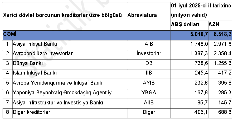 Hökumətin xarici borc portfelində ən böyük pay Asiya İnkişaf Bankına (AİB) məxsusdur - bu qurumdan cəlb edilmiş borlar 1,75 milyard dollar və ya 2,97 milyard manat həcmində olub və ümumi portfelin 34,9 faizin təşkil edib.