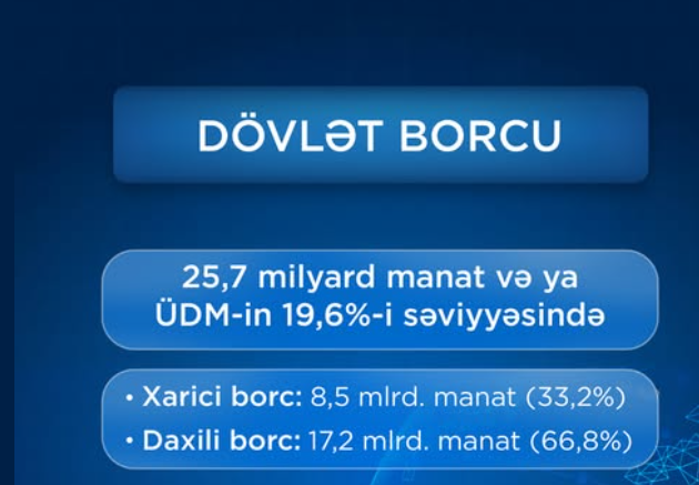 2025-ci il iyulun 1-nə olan dövrdə Azərbaycanın dövlət borcu (daxili və xarici dövlət borcu) 25,7 milyard manat təşkil edib ki, bu da Ümumi Daxili Məhsulun (ÜDM) 19,6 faizi deməkdir. Ümumi dövlət borcunun 8,5 milyard manatı (5 milyard dollar) və ya 33,2 faizi xarici dövlət borcunun, 17,1 milyard manatı və ya 66,8 faizi daxili dövlət borcunun payına düşür.