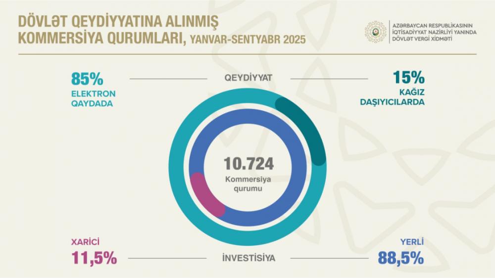 Oktyabr ayının 1-nə qeydiyyatda olan kommersiya qurumlarının sayı ötən ilin müvafiq dövrü ilə müqayisədə 7,8 faiz artaraq 200 min 806 vahid təşkil edib. 2025-ci ilin yanvar-sentyabr aylarında 10 min 724 vahid kommersiya qurumu dövlət qeydiyyatından keçib ki, bunun da 88,5 faizi yerli investisiyalı, 11,5 faizi isə xarici investisiyalıdır.