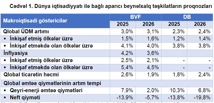 Hər iki qurumun artım proqnozları yüksək tarif gözləntiləri fonunda qabaqlayıcı tədbirlərin görülməsi, effektiv tarif dərəcələrinin azalması, ABŞ dollarının zəifləməsi, eləcə də güclü iqtisadiyyata malik ölkələrdə tətbiq edilən və gözlənilən fiskal stimullaşdırma tədbirləri ilə izah olunur.