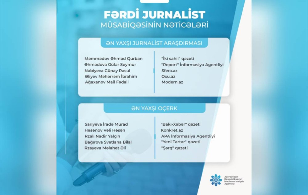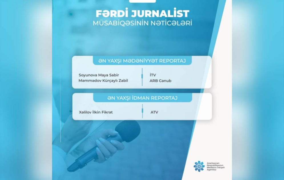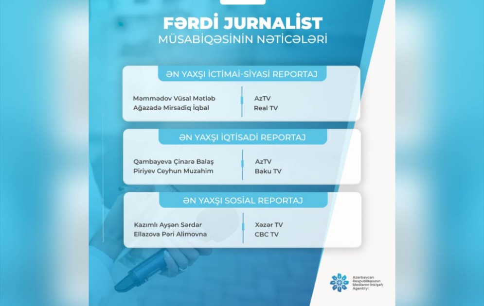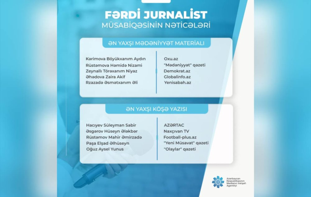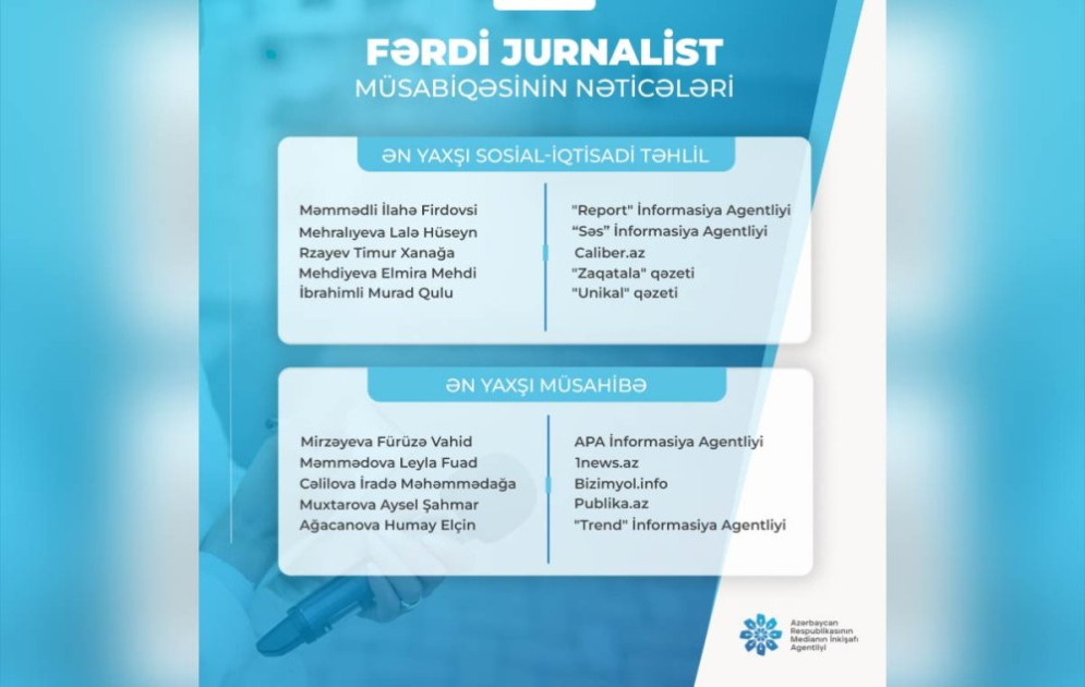 Azərbaycan Respublikasının Medianın İnkişafı Agentliyi tərəfindən oktyabrın 29-da elan olunmuş "Fərdi jurnalist müsabiqəsi"nin nəticələri açıqlanıb.
