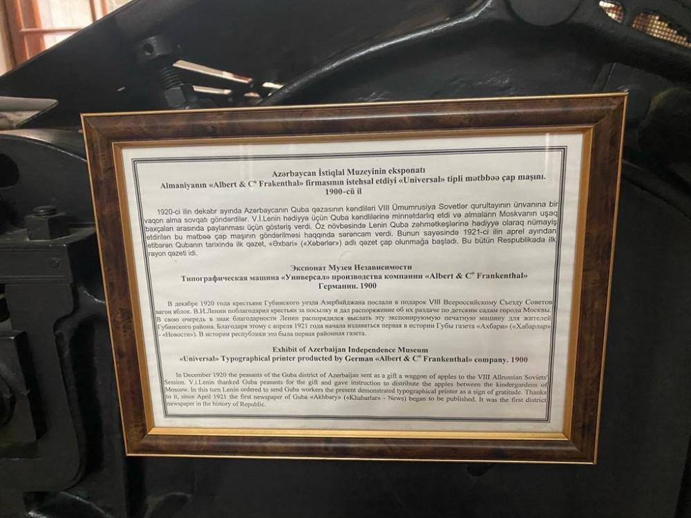 Bu gün yolumuz İstiqlal muzeyinədir. Muzeydə ilk qarşımıza çıxan və diqqətimizi çəkən bir eksponatdan danışmaq istərdik. Söhbət “Universal” tipli mətbəə çap maşınında gedir. Çap maşının olduqca maraqlı tarixçəsi var. 1900-cu illərə birlikdə virtual səfər edək. Deyilənə görə, bu çap maşınını Lenin qubalılara hədiyyə edib. Belə ki, 1920-ci ilin dekabrında Azərbaycanın Quba qəzasının kəndliləri VIII Ümumrusiya Sovetlər Qurultayının ünvanına bir vaqon alma sovqatı göndərir. Sovqatı Quba Qəza İnqilab Komitəsinin sədri Qasım İsmayılov Rusiya Federativ Respublikasının Xalq Komissarları Sovetinin sədri Vladimir İliç Leninə şəxsən çatdırır. Deyilənə görə, Lenin almaların Moskvanın uşaq bağçaları arasında paylanılması üçün göstəriş verir, ikisi də özünün payına düşür. Quba almalarının dadı Leninin xoşuna gəlir. Nəticədə o, Quba kəndlilərinə minnətdarlıq edir və sakinlərə çap maşınını hədiyyə etmək qərarına gəlir.