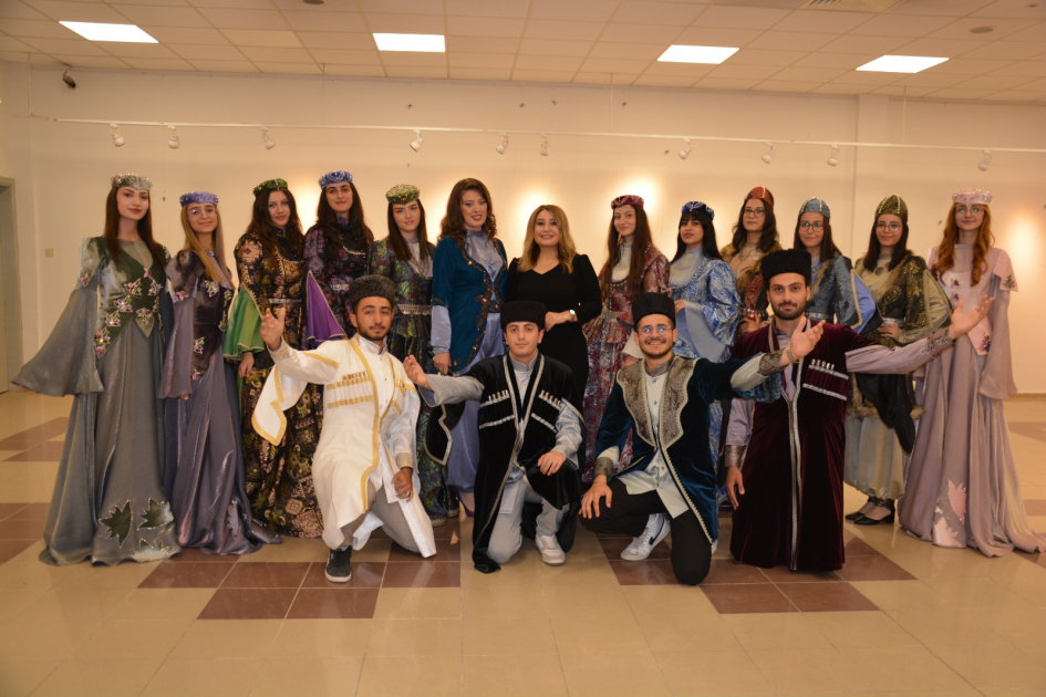 AZƏRTAC xəbər verir ki, Bakı Milli Geyim Evinin rəhbəri Könül Vəlibəylinin şəxsi kolleksiyasından seçilən ənənəvi tarixi Azərbaycan geyimləri Qarabağ şikəstəsinin sədaları altında universitetin ədəbiyyat fakültəsinin tələbələri tərəfindən təqdim edilib.
