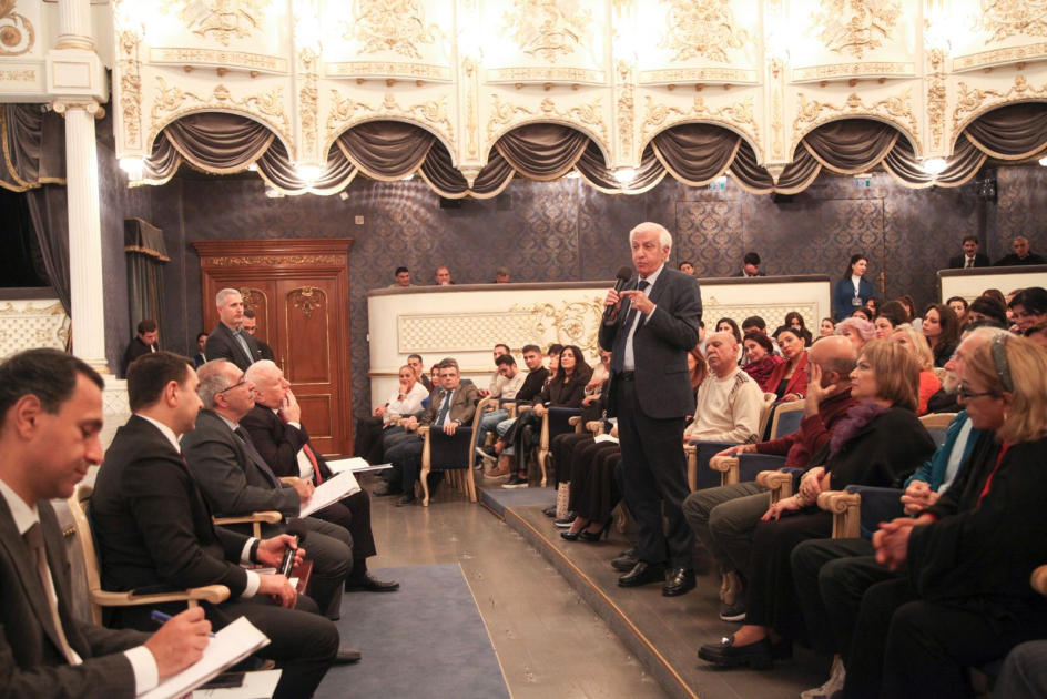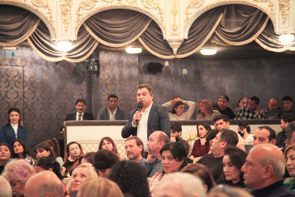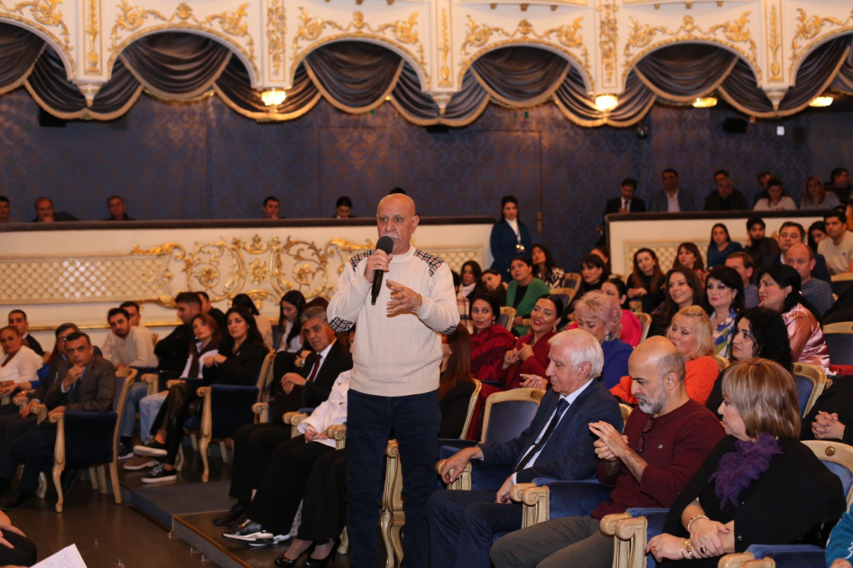 Teatrın əməkdaşları – Xalq artistləri İlham Namiq Kamal, Afaq Bəşirqızı, Fatma Mahmudova, Əməkdar artistlər Əzizağa Əzizov, Ələkbər Əliyev, Əkbər Əlizadə, Nadir Xasiyev, Əməkdar incəsənət xadimi dirijor Fəxrəddin Atayev, aktyorlar Gülcahan Salamova, Eleonora Mustafayeva, Gültac Əlili, xor artistləri Aydan Əliyeva, Günel Qafarova, teatrın quruluşçu rəssamı Əməkdar artist Nabat Səmədova, teatrın baş rəssamı Vüsal Rəhim və başqaları çıxış edərək təklif və müraciətlərini dilə gətiriblər.