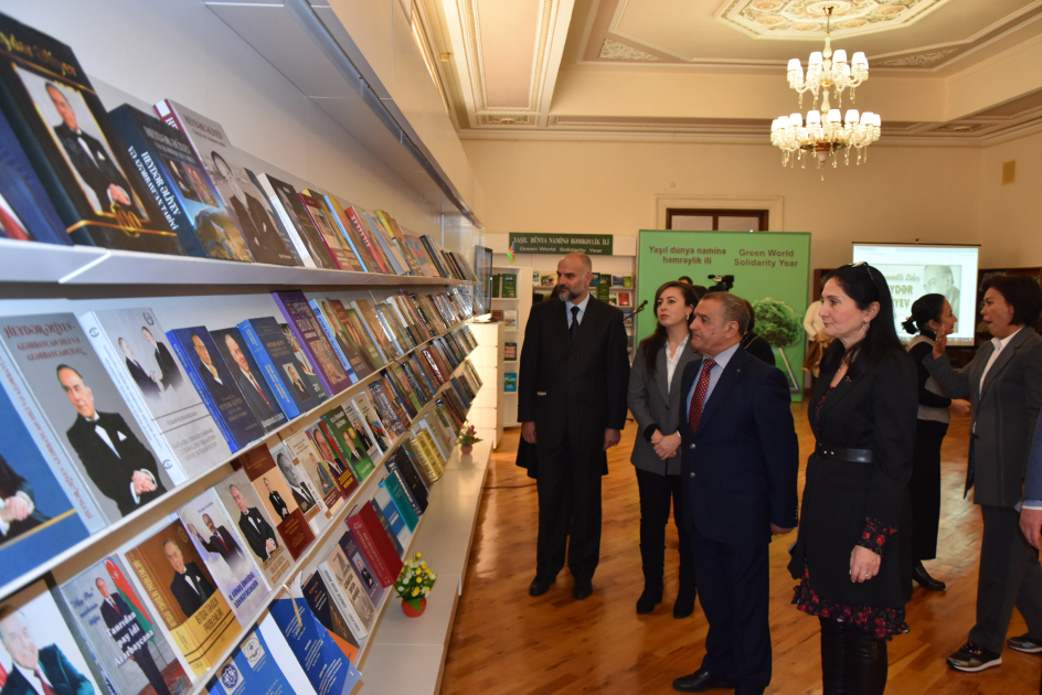 Daha sonra tədbir iştirakçıları təşkil olunmuş sərgiyə baxıblar. Sərgidə kitabxananın fondlarında qorunan dahi şəxsiyyətin həyatının müxtəlif dövrlərini əks etdirən kitablar, sənədlər, fotolar nümayiş olunur.