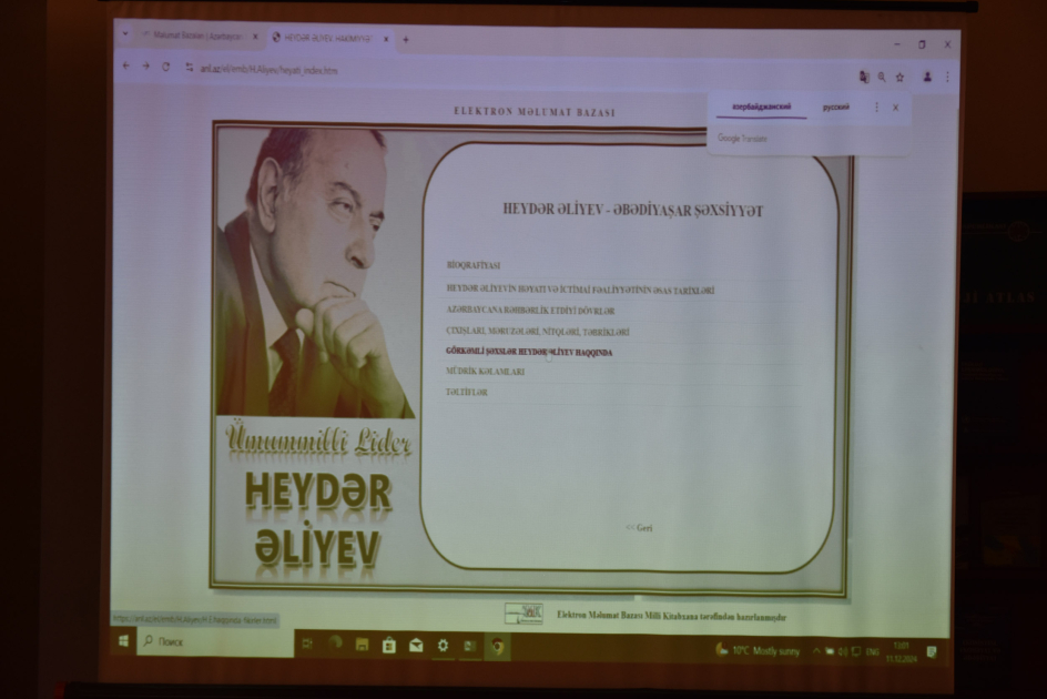 Dekabrın 11-də Milli Kitabxanada TÜRKSOY Beynəlxalq Mədəniyyət Təşkilatı, Qazaxıstan, Qırğızıstan, Özbəkistan, Macarıstan, Şimali Kipr Türk Respublikası və digər ölkələrin milli kitabxana direktorlarının iştirakı ilə Ümummilli Lider Heydər Əliyevin xatirəsinə həsr olunmuş kitab sərgisinin açılışı və elektron məlumat bazasının təqdimatı keçirilib.