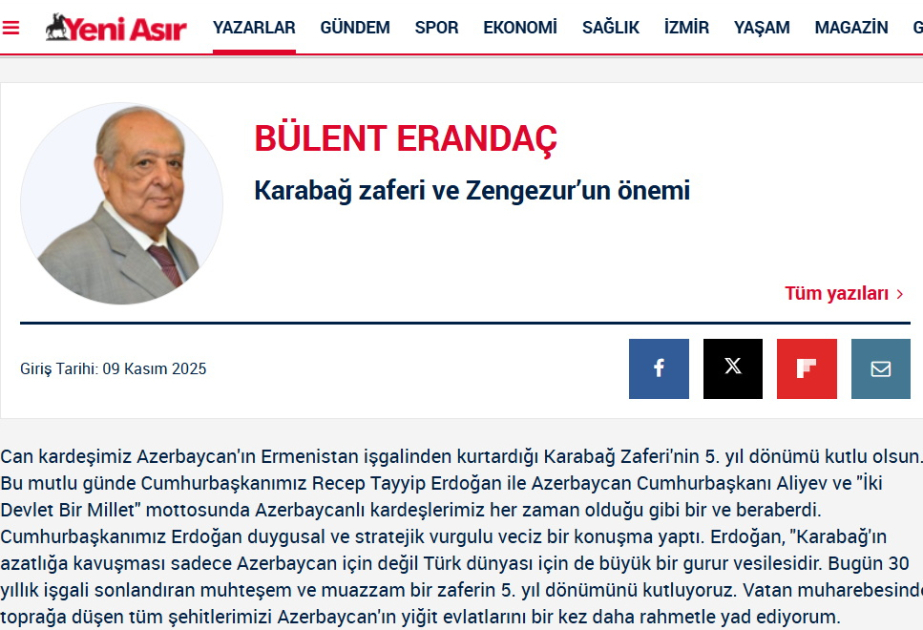 AZƏRTAC xəbər verir ki, bu barədə türkiyəli ekspert Bülent Erandaçın bazar günü “Yeni Asır” qəzetində dərc olunmuş “Qarabağda Qələbə və Zəngəzur dəhlizi" adlı məqaləsində deyilir.