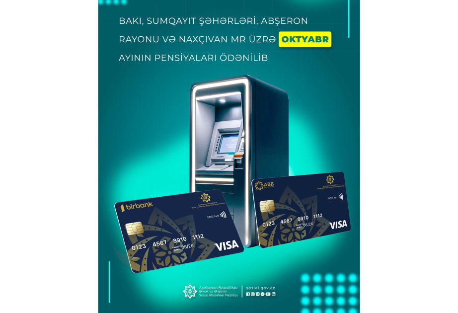 Əmək və Əhalinin Sosial Müdafiəsi Nazirliyinin tabeliyində Dövlət Sosial Müdafiə Fondu tərəfindən Bakı, Sumqayıt şəhərləri və Abşeron rayonu üzrə oktyabr ayının pensiyaları ödənilib.
