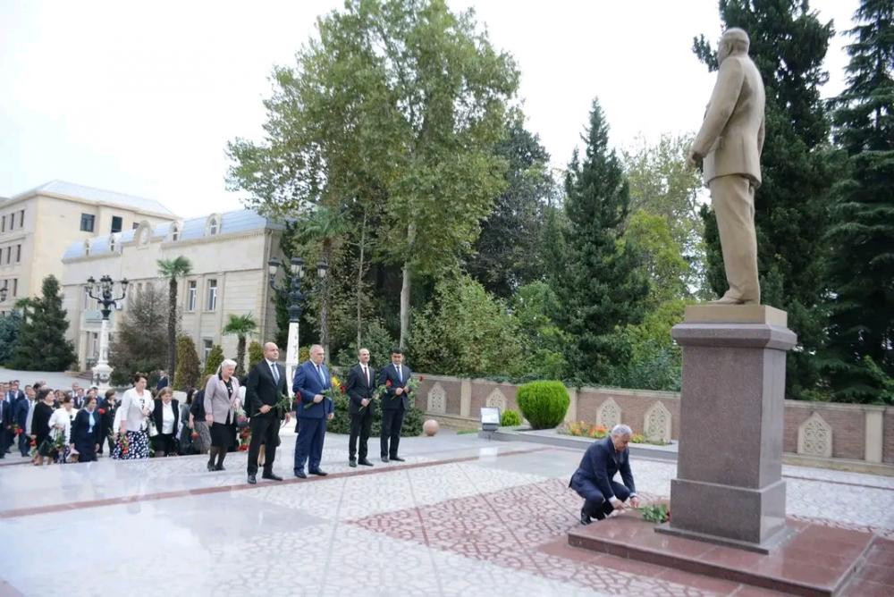 Təhsil işçiləri əvvəlcə Ümummilli liderin abidəsini ziyarət edib, önünə gül dəstələri düzüblər.