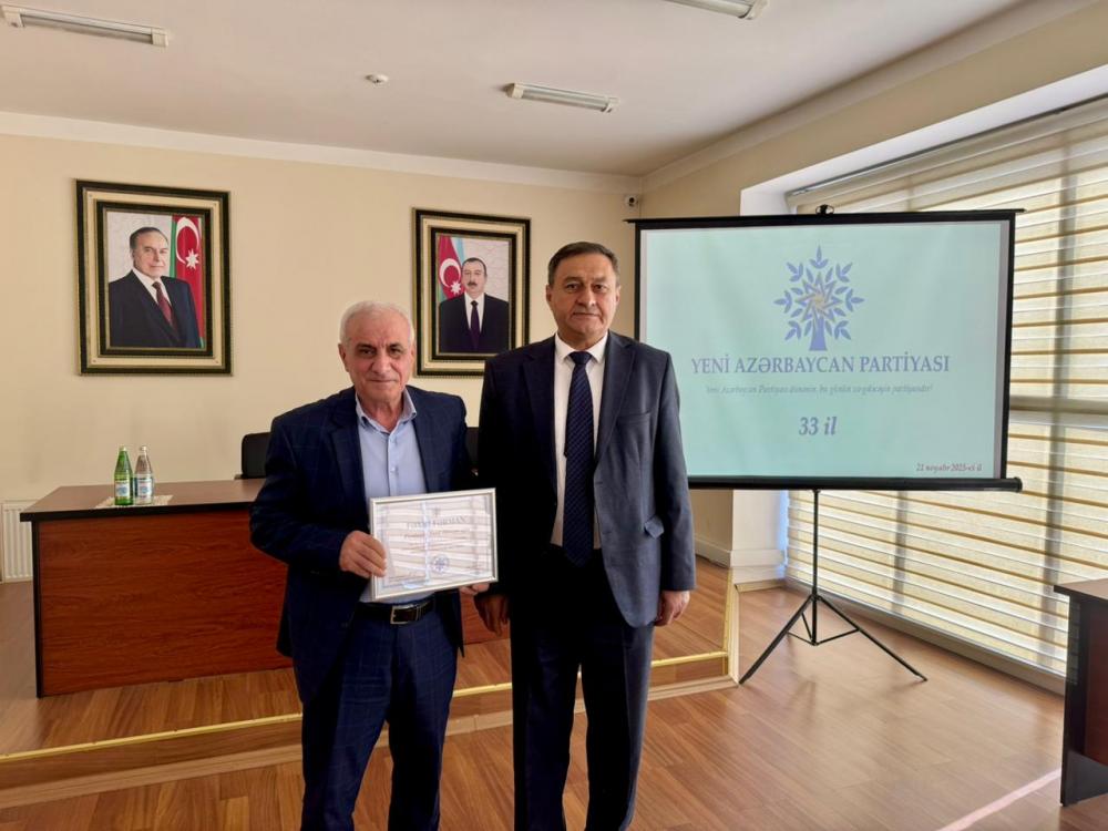 Sonda Yeni Azərbaycan Partiyasının yaradılmasının 33-cü ildönümü münasibətilə partiyanın ictimai-siyasi həyatında fəal iştirak edən üzvlərə fəxri fərman təqdim edilib.