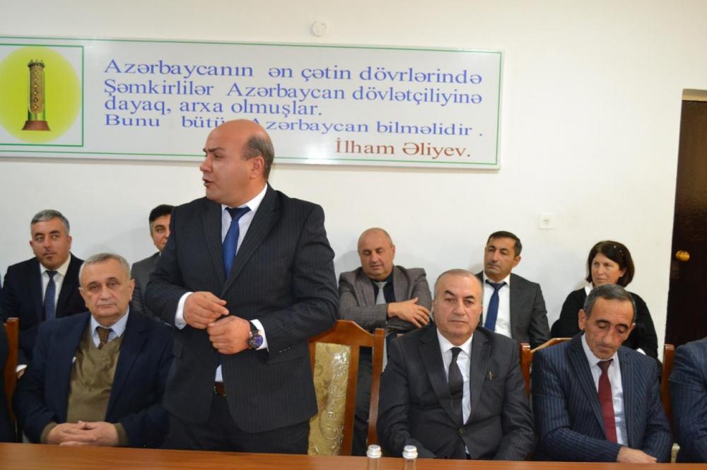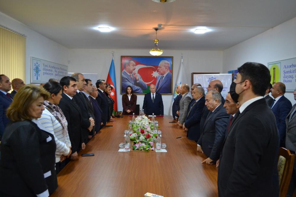 Sonra tədbiri giriş sözü ilə açan Yeni Azərbaycan Partiyası Şəmkir rayon təşkilatının sədri Fəxrəddin Vəliyev qeyd etmişdir ki, “Müasir Azərbaycan dövlətinin qurucusu, ölkəmizin milli dövlətçilik ənənələrinin qurulmasında və inkişafında misilsiz xidmətləri olan dahi rəhbər, Ümummilli Lider Heydər Əliyev tərəfindən müəyyənləşdirilən siyasi kurs bu gün ölkə Prezidenti cənab İlham Əliyev tərəfindən uğurla davam etdirilir. Cənab Prezident İlham Əliyev ölkəmizə rəhbərlik etdiyi bu illər ərzində Ulu Öndər Heydər Əliyevin ideyalarına və siyasi strategiyasına daim sadiq qalaraq, onları yeni çalarlarla və müasir dövrün tələblərinə uyğun şəkildə uğurla davam etdirir. 30 ilə yaxın davam edən Dağlıq Qarabağ münaqişəsi məhz Müzəffər Ali Baş Komandan cənab İlham Əliyevin qətiyyəti, cəsarəti və siyasi iradəsi sayəsində öz həllini tapıb. Bizə bu günləri yaşadan, tarixi Zəfərimizə imza atan cənab Prezidentə hər zaman minnətdarıq. Hazırda qarşıda dövlət başçısı cənab İlham Əliyevin rəhbərliyi ilə Qarabağda həyatı dirçəltmək, bərpa etmək kimi mühüm və şərəfli bir vəzifə dayanır.