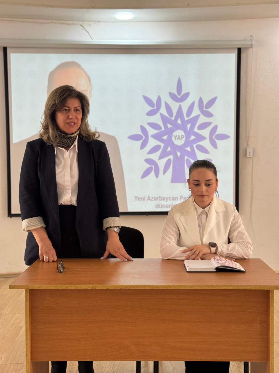 Tədbiri giriş sözü ilə açan YAP Xəzər rayon təşkilatının məsləhətçisi Nəzrin Bayramova partiyanın yarandığı mürəkkəb tarixi-siyasi şəraitdən, keçdiyi çətin və şərəfli yoldan bəhs edib. O bildirib ki, Yeni Azərbaycan Partiyası yarandığı gündən etibarən ümumxalq partiyası kimi böyük nüfuz qazanıb, sıraları kəmiyyət və keyfiyyət baxımından daha da möhkəmlənib. Təşkilatın sədri Ulu Öndər Heydər Əliyevin və Prezident İlham Əliyevin xalq, dövlət qarşısındakı xidmətlərindən, Azərbaycanın Zəfər tarixindən danışıb.