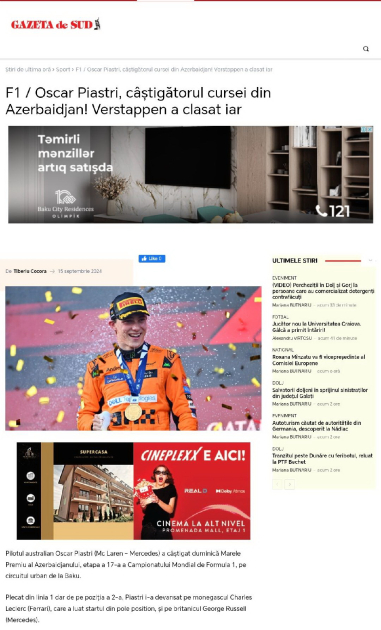 AZƏRTAC-ın məlumatına görə, “GSP”, “G4media”, “Pitstop”, AGERPRES xəbər agentlikləri paytaxtımızın 2016-cı ildən Formula 1 yarışlarına ev sahibliyi etdiyini və pilotların Bakı Şəhər Halqasında iki saat ərzində 51 dövrə vurduğunu yazıb. Bildirilib ki, “McLaren” komandasının avstraliyalı pilotu Oskar Piastri bu yarışda birinci yeri tutub, Şarl Lekler (“Ferrari”) ikinci, Corc Rassell (“Mercedes”) isə üçüncü olub.